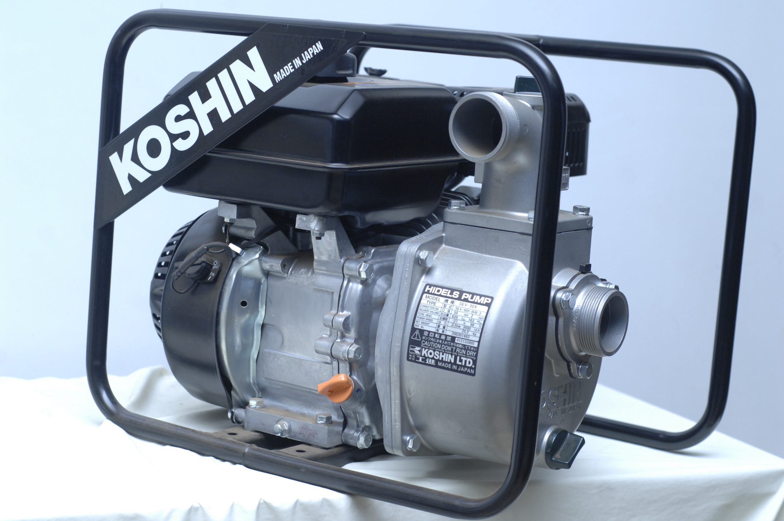 The SEV- is a high quality Japanese self-priming 2″ or 3’’ pump of Koshin Ltd. for clear water with solid particles up to 3mm. This pump is powered by K180 gasoline engine. The product has a sturdy rollover pipe frame, 2″ inlet and outlet, die-cast aluminum housing, rugged four-stroke engine, low oil alert, 3.6-liter fuel tank, engine tool, a filter, 2 hose couplings and three hose bands. They are fully portable design suitable for irrigation, de-watering and general water transfer applications.